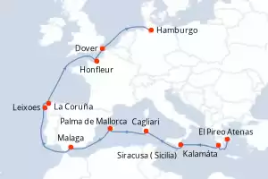 Francia, Alemania, Reino Unido, España, Portugal, Italia, Grecia Itinerario: El Pireo Atenas , Kalamáta , Siracusa ( Sicilia) , Cagliari , Palma de Mallorca , Malaga , Leixoes , La Coruña , Honfleur , Dover , Hamburgo Comidas incluidas Vasco da Gama 18 días Camarote estándar El Pireo Atenas 28/04/2027 desde US$3688 EL PRECIO NO INCLUYE LA PERCEPCIÓN DEL 30% DE AFIP - RG 5463 TARIFA NO REEMBOLSABLE Comidas incluidas Ver las ofertas