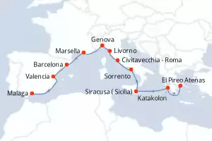 Italia, Grecia, España, Francia Itinerario: El Pireo Atenas , Katakolon , Malaga - Corfu , Siracusa ( Sicilia) , Sorrento , Civitavecchia - Roma , Livorno , Genova , Marsella , Barcelona , Valencia , Malaga Comidas incluidas Vasco da Gama 14 días Camarote estándar El Pireo Atenas 04/04/2026 desde US$2927 EL PRECIO NO INCLUYE LA PERCEPCIÓN DEL 30% DE AFIP - RG 5463 TARIFA NO REEMBOLSABLE Comidas incluidas Ver las ofertas