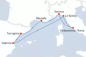 Francia, España, Italia Itinerario: Marsella , Genova , Livorno , Civitavecchia - Roma , Valencia , Barcelona , Marsella Comidas incluidas MSC Orchestra 8 días Camarote estándar Marsella 24/11/2025 desde US$409 NAVEGA CON CONFIANZA EL PRECIO NO INCLUYE LA PERCEPCIÓN DEL 30% DE AFIP - RG 5463 TARIFA NO REEMBOLSABLE Comidas incluidas Otros puertos de embarque : Barcelona Livorno Valencia Civitavecchia - Roma Genova Otras fechas : 17 nov. 25 1-8-15-22-29 dic. 25 5-12-19-26 ene. 26 Otras fechas Ver las ofertas