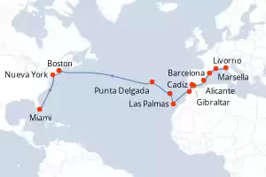 Portugal, España, Marruecos, Reino Unido, Francia, Italia, Estados Unidos Itinerario: Livorno , Marsella , Barcelona , Alicante , Gibraltar , Cadiz , Casablanca , Las Palmas , Funchal , Punta Delgada , Punta Delgada , Boston , Boston , Nueva York , Miami Comidas incluidas MSC Meraviglia 25 días Camarote estándar Livorno 18/10/2026 desde US$2059 NAVEGA CON CONFIANZA EL PRECIO NO INCLUYE LA PERCEPCIÓN DEL 30% DE AFIP - RG 5463 TARIFA NO REEMBOLSABLE Comidas incluidas Ver las ofertas