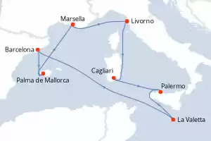 Italia, Francia, España, Malta Itinerario: Livorno , Cagliari , Palermo , La Valetta , Barcelona , Palma de Mallorca , Marsella , Livorno Comidas incluidas MSC Splendida 9 días Suite Livorno 27/04/2026 desde US$1929 NAVEGA CON CONFIANZA EL PRECIO NO INCLUYE LA PERCEPCIÓN DEL 30% DE AFIP - RG 5463 TARIFA NO REEMBOLSABLE Comidas incluidas Otros puertos de embarque : Cagliari Palermo La Valetta Barcelona Ver las ofertas