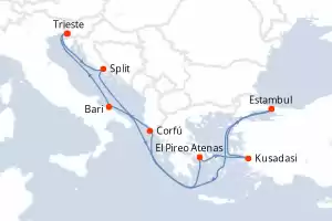Italia, Grecia, Turquía, Croacia Itinerario: Bari , Trieste , Split , El Pireo Atenas , Kusadasi , Estambul , Corfú , Bari Comidas incluidas MSC Splendida 10 días Suite Bari 05/11/2027 desde US$4029 NAVEGA CON CONFIANZA EL PRECIO NO INCLUYE LA PERCEPCIÓN DEL 30% DE AFIP - RG 5463 TARIFA NO REEMBOLSABLE Comidas incluidas Otros puertos de embarque : Trieste Estambul El Pireo Atenas Otras fechas : 30 abr. 27 9-18-27 mayo 27 5-14-23 jun. 27 Otras fechas Ver las ofertas