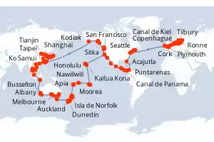 Estados Unidos,Francia,Samoa,Fidji (islas),Nueva Zelanda,Australia,Indonesia,Singapur,Tailandia,Camboya,Vietnam,China,Taiwán,Japón,Corea del Sur,Canadá,México,Guatemala,Salvador,Costa Rica,Panamá,Colo Itinerario: San Francisco , Honolulu , Honolulu , Nawiliwili , Kailua Kona , Moorea , Bora Bora , Papeete , Bora Bora , Pago Pago , Apia , Savusavu , Lautoka , Isla de Norfolk , Auckland , Auckland , Tauranga , Napier , Picton , Christchurch , Dunedin , île Stewart , Milford sound , Hobart , Melbourne , Eden , Sidney , Sidney , Penneshaw , Adelaide , Port Lincoln , Albany , Bussleton , Fremantle , Fremantle , Benoa , Celukan Bawang , Singapur , Ko Samui , Laem Chabang , Laem Chabang , Sihanoukville , Ho Chi Minh-Ville , Ho Chi Minh-Ville , Ho Chi Minh-Ville , Da Nang , Ha Long Bay , Ha Long Bay , Hong Kong , Hong Kong , Taipei , Ishigaki , Okinawa , Shanghai , Shanghai , Shanghai , Dalian , Tianjin , Tianjin , Incheon , Yeosu , Busan , Busan , Hakata , kitakyushu , Hiroshima , Beppu , Kochi , Kobe , Kobe , Shimizu , Tokyo , Tokyo , Oarai , Miyako , Kodiak , Juneau , Sitka , Ketchikán , Vancouver , Seattle , Victoria , Astoria , San Francisco , San Diego , Cabo san Lucas , Acapulco , Puerto Quetzal , Acajutla , Puntarenas , Canal de Panama , Cartagena de Indias , Cartagena de Indias , Miami , Nueva York , Newport , Canale del capo cod , Boston , Halifax , Saint John , Cork , Cork , Plymouth , Le Havre , Tilbury , Ijmuiden , Canal de Kiel , Warnemunde , Ronne , Gdansk , Klaipeda , Riga , Tallin , Helsingborg , Estocolmo , Estocolmo , Copenhague Comidas incluidas Azamara Quest 189 días Camarote exterior San Francisco 05/01/2027 desde US$74254 EL PRECIO NO INCLUYE LA PERCEPCIÓN DEL 30% DE AFIP - RG 5463 TARIFA NO REEMBOLSABLE Comidas incluidas Ver las ofertas