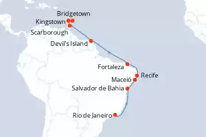 Barbados, Santa Lucia, Estados Unidos, Reino Unido, Brasil, Francia Itinerario: Miami , Charlotte Amalie , St. Johns , Castries , Bridgetown , Devil's Island , Belem , Recife , Maceió , Salvador de Bahia , Buzios , Rio de Janeiro Comidas incluidas Seven Seas Mariner 19 días Suite Miami 04/01/2027 desde US$12812 EL PRECIO NO INCLUYE LA PERCEPCIÓN DEL 30% DE AFIP - RG 5463 TARIFA NO REEMBOLSABLE Ver las ofertas
