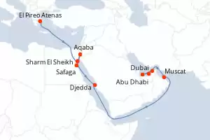 Emiratos Árabes Unidos, Oman, Arabia Saudí, Egipto, Jordania, Grecia Itinerario: El Pireo Atenas , Sharm El Sheikh , Aqaba , Aqaba , Safaga , Safaga , Djedda , Djedda , Muscat , Abu Dhabi , Sir Bani Yas Abou Dhabi , Dubai Comidas incluidas Seven Seas Voyager 22 días Suite El Pireo Atenas 07/12/2026 desde US$13591 EL PRECIO NO INCLUYE LA PERCEPCIÓN DEL 30% DE AFIP - RG 5463 TARIFA NO REEMBOLSABLE Ver las ofertas