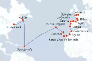 España, Portugal, Marruecos, Antigua y Barbuda, Canadá, Estados Unidos, Francia, Reino Unido Itinerario: Nueva York , Halifax , Saint John's , Punta Delgada , Funchal , Santa Cruz de Tenerife , Arrecife , Agadir , Casablanca , Lisboa , Oporto , La Coruña , Gijón , Bilbao , Burdeos , Burdeos , La Rochelle , St Helier , Le Havre Comidas incluidas Seven Seas Mariner 29 días Suite Nueva York 29/04/2027 desde US$20594 EL PRECIO NO INCLUYE LA PERCEPCIÓN DEL 30% DE AFIP - RG 5463 TARIFA NO REEMBOLSABLE Ver las ofertas