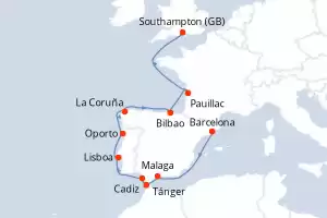 España, Portugal, Marruecos, Francia, Reino Unido Itinerario: Barcelona , Malaga , Tánger , Cadiz , Lisboa , Lisboa , Oporto , La Coruña , Bilbao , Pauillac , Pauillac , Southampton , Southampton Comidas incluidas Seven Seas Prestige 15 días Suite Barcelona 11/05/2027 desde US$16413 EL PRECIO NO INCLUYE LA PERCEPCIÓN DEL 30% DE AFIP - RG 5463 TARIFA NO REEMBOLSABLE Ver las ofertas