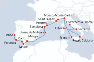 Italia, Monaco, Francia, España, Marruecos, Portugal Itinerario: Lisboa , Portimao , Cadiz , Tánger , Malaga , Palma de Mallorca , Barcelona , Palamos , Saint Tropez , Monaco Monte-Carlo , La Spezia , Trapani , Reggio Calabria , Olbia , Sorrento , Civitavecchia - Roma Comidas incluidas Seven Seas Grandeur 18 días Suite Lisboa 08/05/2027 desde US$12753 EL PRECIO NO INCLUYE LA PERCEPCIÓN DEL 30% DE AFIP - RG 5463 TARIFA NO REEMBOLSABLE Ver las ofertas