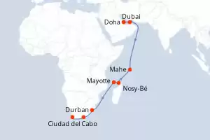 Sudafrica, Francia, Madagascar, Seychelles, Emiratos Árabes Unidos, Qatar Itinerario: Doha , Dubai , Mahe , Nosy-Bé , Mayotte , Durban , Puerto Elizabeth , Puerto Elizabeth , Ciudad del Cabo Comidas incluidas Seven Seas Navigator 21 días Suite Doha 22/05/2026 desde US$10190 EL PRECIO NO INCLUYE LA PERCEPCIÓN DEL 30% DE AFIP - RG 5463 TARIFA NO REEMBOLSABLE Ver las ofertas