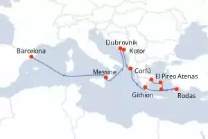 España, Grecia, Montenegro, Croacia, Italia Itinerario: Barcelona , Messine , Dubrovnik , Kotor , Corfú , Githion , Rodas , Santoríni , Mykonos , El Pireo Atenas Comidas incluidas Seven Seas Voyager 13 días Suite Barcelona 21/05/2026 desde US$12127 EL PRECIO NO INCLUYE LA PERCEPCIÓN DEL 30% DE AFIP - RG 5463 TARIFA NO REEMBOLSABLE Ver las ofertas