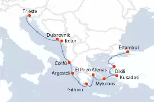 Italia, Croacia, Montenegro, Grecia, Turquía Itinerario: Estambul , Dikili , Kusadasi , Mykonos , El Pireo Atenas , Githion , Argostoli , Corfú , Kotor , Dubrovnik , Trieste Comidas incluidas Seven Seas Grandeur 13 días Suite Estambul 05/05/2026 desde US$10462 EL PRECIO NO INCLUYE LA PERCEPCIÓN DEL 30% DE AFIP - RG 5463 TARIFA NO REEMBOLSABLE Ver las ofertas