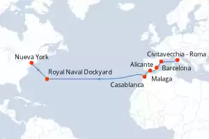 Marruecos, Estados Unidos, España, Reino Unido, Italia Itinerario: Civitavecchia - Roma , Barcelona , Alicante , Malaga , Casablanca , Royal Naval Dockyard , Nueva York Comidas incluidas Seven Seas Splendor 15 días Suite Civitavecchia - Roma 18/05/2027 desde US$9930 EL PRECIO NO INCLUYE LA PERCEPCIÓN DEL 30% DE AFIP - RG 5463 TARIFA NO REEMBOLSABLE Ver las ofertas