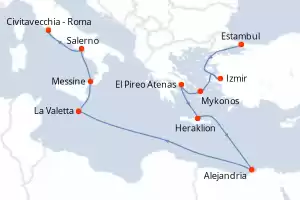 Malta, Egipto, Grecia, Turquía, Italia Itinerario: Estambul , Izmir , Mykonos , El Pireo Atenas , Heraklion , Alejandria , Alejandria , La Valetta , Messine , Salerno , Civitavecchia - Roma Comidas incluidas Seven Seas Navigator 15 días Suite Estambul 02/10/2026 desde US$11501 EL PRECIO NO INCLUYE LA PERCEPCIÓN DEL 30% DE AFIP - RG 5463 TARIFA NO REEMBOLSABLE Ver las ofertas