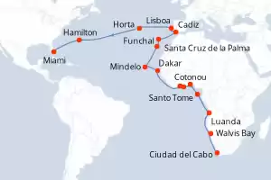 Senegal, Benin, Costa de Marfil, Sao Tomé et Principe, Angola, Namibia, Sudafrica, Ghana, Portugal, Estados Unidos, Reino Unido, España, Cabo Verde Itinerario: Ciudad del Cabo , Walvis Bay , Walvis Bay , Luanda , Santo Tome , Cotonou , Takoradi , Abidjan , Dakar , Mindelo , Santa Cruz de la Palma , Funchal , Cadiz , Lisboa , Horta , Hamilton , Miami Comidas incluidas Seven Seas Mariner 36 días Suite Ciudad del Cabo 09/05/2026 desde US$25506 EL PRECIO NO INCLUYE LA PERCEPCIÓN DEL 30% DE AFIP - RG 5463 TARIFA NO REEMBOLSABLE Ver las ofertas