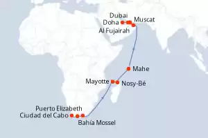 Sudafrica,Francia,Madagascar,Seychelles,Oman,Emiratos Árabes Unidos,Qatar Itinerario: Ciudad del Cabo , Bahía Mossel , Puerto Elizabeth , Mayotte , Nosy-Bé , Mahe , Mahe , Muscat , Al Fujairah , Dubai , Doha Comidas incluidas Seven Seas Navigator 20 días Suite Ciudad del Cabo 25/11/2025 desde US$13001 EL PRECIO NO INCLUYE LA PERCEPCIÓN DEL 30% DE AFIP - RG 5463 TARIFA NO REEMBOLSABLE Ver las ofertas