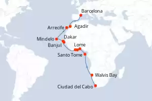Angola, Ghana, Namibia, Portugal, Sudafrica, España, Cabo Verde, Senegal, Benin, Costa de Marfil, Sao Tomé et Principe Itinerario: Ciudad del Cabo , Walvis Bay , Walvis Bay , Luanda , Santo Tome , Cotonou , Takoradi , Abidjan , Dakar , Mindelo , Santa Cruz de la Palma , Funchal , Cadiz , Lisboa Comidas incluidas Seven Seas Mariner 25 días Suite Ciudad del Cabo 09/05/2026 desde US$17453 EL PRECIO NO INCLUYE LA PERCEPCIÓN DEL 30% DE AFIP - RG 5463 TARIFA NO REEMBOLSABLE Ver las ofertas