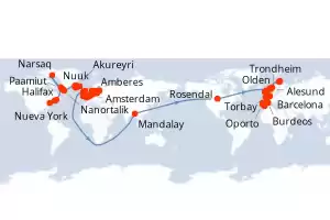 Estados Unidos,Canadá,Groenlandia,Islandia,Irlanda,Reino Unido,Francia,Paises Bajos,Suecia,Alemania,Letonia,Finlandia,Estonia,Dinamarca,Myanmar,Noruega,Bélgica,Portugal,España Itinerario: Nueva York , Halifax , Sidney , Nuuk , Paamiut , Narsaq , Qaqortoq , Nanortalik , Isafjordhur , Akureyri , Grundarfjordur , Reykjavik , Reykjavik , Heimaey , Seydisfjordhur , Kirkwall , Stornoway , Killybegs , Douglas , Dun Laoghaire , Liverpool , Holyhead , Waterford , Southampton , Honfleur , Amberes , Amberes , Amsterdam , Lysekil , Arhus , Warnemunde , Liepaja , Visby , Helsinki , Tallin , Estocolmo , Estocolmo , Copenhague , Copenhague , Lysekil , Oslo , Skagen , Mandalay , Rosendal , Olden , Kristiansund , Trondheim , Hammerfest , Honningsvag , Torbay , Alesund , Maloy , Lerwick , Invergordon , Zeebrugge , Amsterdam , Burdeos , Burdeos , Oporto , Lisboa , Cadiz , Malaga , Barcelona Comidas incluidas Seven Seas Mariner 82 días Suite Nueva York 29/06/2026 desde US$74525 EL PRECIO NO INCLUYE LA PERCEPCIÓN DEL 30% DE AFIP - RG 5463 TARIFA NO REEMBOLSABLE Ver las ofertas