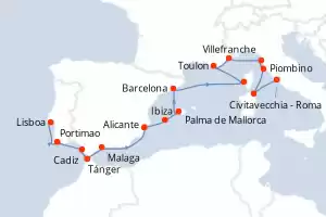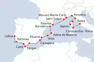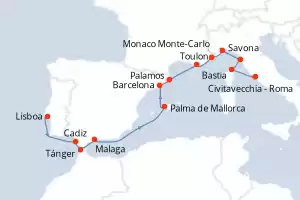 Italia, Francia, Monaco, España, Marruecos, Portugal Itinerario: Lisboa , Cadiz , Tánger , Malaga , Palma de Mallorca , Barcelona , Palamos , Toulon , Monaco Monte-Carlo , Savona , Pisa/Florencia (Livorno) , Bastia , Civitavecchia - Roma Comidas incluidas Seven Seas Splendor 15 días Suite Lisboa 17/10/2027 desde US$11820 EL PRECIO NO INCLUYE LA PERCEPCIÓN DEL 30% DE AFIP - RG 5463 TARIFA NO REEMBOLSABLE Ver las ofertas