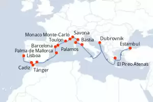 Marruecos, Turquía, España, Portugal, Grecia, Croacia, Italia, Francia, Monaco Itinerario: Lisboa , Cadiz , Tánger , Malaga , Palma de Mallorca , Barcelona , Palamos , Toulon , Monaco Monte-Carlo , Savona , Pisa/Florencia (Livorno) , Bastia , Civitavecchia - Roma , Dubrovnik , Dubrovnik , El Pireo Atenas , El Pireo Atenas , Estambul , Estambul Comidas incluidas Seven Seas Splendor 24 días Suite Lisboa 17/10/2027 desde US$17878 EL PRECIO NO INCLUYE LA PERCEPCIÓN DEL 30% DE AFIP - RG 5463 TARIFA NO REEMBOLSABLE Ver las ofertas