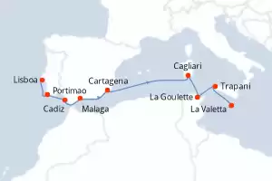 Italia, España, Portugal, Malta, Túnez Itinerario: Lisboa , Portimao , Cadiz , Malaga , Malaga , Cartagena , Cagliari , La Goulette , Trapani , La Valetta Comidas incluidas Seven Seas Grandeur 12 días Suite Lisboa 09/10/2026 desde US$11395 EL PRECIO NO INCLUYE LA PERCEPCIÓN DEL 30% DE AFIP - RG 5463 TARIFA NO REEMBOLSABLE Ver las ofertas