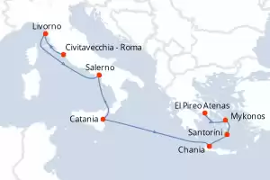 Grecia, Italia Itinerario: Civitavecchia - Roma , Livorno , Salerno , Catania , Chania , Santoríni , Mykonos , Mykonos , El Pireo Atenas Comidas incluidas Scarlet Lady 11 días Camarote estándar Civitavecchia - Roma 31/08/2026 desde US$2728 Comidas incluidas Ver las ofertas