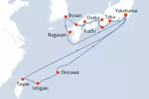 Corea del Sur, Taiwán, Japón Itinerario: Yokohama , Taipei , Taipei , Ishigaki , Okinawa , Yokohama , Toba , Osaka , Kochi , Hiroshima , Kanmon Straits , Busan , Nagasaki , Yokohama Comidas incluidas Diamond Princess 19 días Camarote estándar Yokohama 22/09/2026 desde US$3563 EL PRECIO NO INCLUYE LA PERCEPCIÓN DEL 30% DE AFIP - RG 5463 TARIFA NO REEMBOLSABLE Comidas incluidas Ver las ofertas