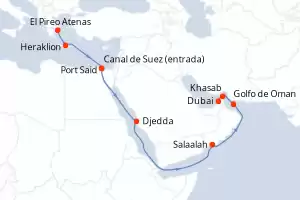 Arabia Saudí, Egipto, Grecia, Emiratos Árabes Unidos, Oman Itinerario: El Pireo Atenas , Heraklion , Port Said , Canal de suez (Entree) , Djedda , Djedda , Salaalah , Golfo de Oman , Khasab , Dubai Comidas incluidas EXPLORA II 16 días Suite El Pireo Atenas 29/11/2026 desde US$9560 Comidas incluidas Ver las ofertas