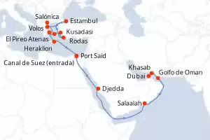 Arabia Saudí, Egipto, Grecia, Turquía, Emiratos Árabes Unidos, Oman Itinerario: El Pireo Atenas , Mykonos , Kusadasi , Rodas , Estambul , Estambul , Volos , Salónica , El Pireo Atenas , Heraklion , Port Said , Canal de suez (Entree) , Djedda , Djedda , Salaalah , Golfo de Oman , Khasab , Dubai Comidas incluidas EXPLORA II 26 días Suite El Pireo Atenas 19/11/2026 desde US$13545 Comidas incluidas Ver las ofertas