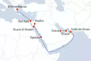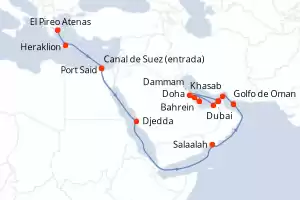 Emiratos Árabes Unidos, Qatar, , Oman, Arabia Saudí, Egipto, Grecia Itinerario: El Pireo Atenas , Heraklion , Port Said , Canal de suez (Entree) , Djedda , Djedda , Salaalah , Golfo de Oman , Khasab , Dubai , Dubai , Abu Dhabi , Bahrein , Doha , Dammam , Dubai Comidas incluidas EXPLORA II 23 días Suite El Pireo Atenas 29/11/2026 desde US$12975 Comidas incluidas Ver las ofertas