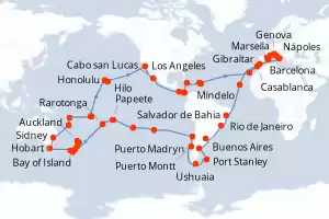 España,Reino Unido,Marruecos,Cabo Verde,Brasil,Argentina,Islas Malvinas,Chile,Iles Cook,Nueva Zelanda,Australia,Nueva Caledonia,Vanuatu,Samoa,Estados Unidos,México,Costa Rica,Panamá,Jamaica,Paises Baj Itinerario: Genova , Marsella , Barcelona , Gibraltar , Casablanca , Mindelo , Salvador de Bahia , Rio de Janeiro , Rio de Janeiro , Buenos Aires , Buenos Aires , Puerto Madryn , Puerto Argentino , Ushuaia , Ushuaia , Puerto Montt , Valparaíso , Valparaíso , Isla de Pascua , Pitcairn , Papeete , Papeete , Moorea , Aitutaki , Rarotonga , Bay of Island , Auckland , Tauranga , Christchurch , Dunedin , Milford sound , Hobart , Hobart , Sidney , Sidney , Nouméa , Luganville , Apia , Pago Pago , Honolulu , Hilo , Los Angeles , Cabo san Lucas , Puntarenas , Canal panama (Enter) , Canal de Panama , Ocho Rios , Road Town , Philipsburg , Las Palmas , Palma de Mallorca , Nápoles , Civitavecchia - Roma , Genova , Marsella , Tarragona , La Coruña , Bilbao , La Rochelle , Brest , Warnemunde Comidas incluidas MSC Magnifica 133 días Camarote estándar Genova 05/01/2027 desde US$19559 NAVEGA CON CONFIANZA EL PRECIO NO INCLUYE LA PERCEPCIÓN DEL 30% DE AFIP - RG 5463 TARIFA NO REEMBOLSABLE Comidas incluidas Ver las ofertas