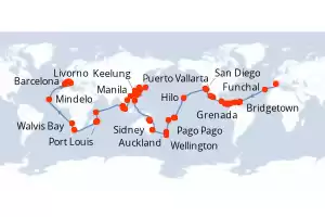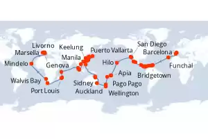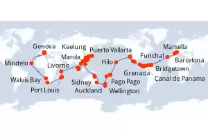 Japón, Estados Unidos, Malasia, Singapur, Vietnam, Taiwán, España, México, China, Filipinas, Francia, Italia, Guatemala, Corea del Sur, Australia, Costa Rica, Panamá, Cabo Verde, Namibia, Nueva Zeland Itinerario: Barcelona , Funchal , Bridgetown , Grenada , Willemstad(Curaçao) , Cartagena de Indias , Puerto Limon , Canal de Panama , Canal panama (Enter) , Puntarenas , Puerto Quetzal , Puerto Vallarta , Cabo san Lucas , San Diego , Los Angeles , Los Angeles , Hilo , Pago Pago , Apia , Suva , Auckland , Auckland , Wellington , Sidney , Sidney , Townsville , Cairns , Manila , Manila , Keelung , Ishigaki , Naha , Tokyo , Tokyo , Nagasaki , Busan , Shanghai , Hong Kong , Da Nang , Singapur , Port Kelang , Penang , Victoria - SC , Port Louis , Port Louis , La possession , Ciudad del Cabo , Ciudad del Cabo , Walvis Bay , Mindelo , Civitavecchia - Roma , Livorno , Genova , Marsella , Barcelona Comidas incluidas MSC Magnifica 132 días Camarote estándar Barcelona 07/01/2026 desde US$21929 NAVEGA CON CONFIANZA EL PRECIO NO INCLUYE LA PERCEPCIÓN DEL 30% DE AFIP - RG 5463 TARIFA NO REEMBOLSABLE Comidas incluidas Otros puertos de embarque : Marsella Genova Ver las ofertas
