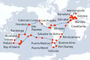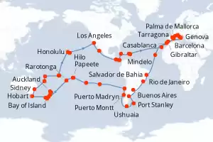 Chile, Nueva Caledonia, Samoa, Argentina, Australia, Vanuatu, Italia, Iles Cook, Islas Malvinas, España, Nueva Zelanda, Brasil, Jamaica, Paises Bajos, Panamá, Reino Unido, Cabo Verde, Costa Rica, Marr Itinerario: Civitavecchia - Roma , Genova , Marsella , Barcelona , Gibraltar , Casablanca , Mindelo , Salvador de Bahia , Rio de Janeiro , Rio de Janeiro , Buenos Aires , Buenos Aires , Puerto Madryn , Puerto Argentino , Ushuaia , Ushuaia , Puerto Montt , Valparaíso , Valparaíso , Isla de Pascua , Pitcairn , Papeete , Papeete , Moorea , Aitutaki , Rarotonga , Bay of Island , Auckland , Tauranga , Christchurch , Dunedin , Milford sound , Hobart , Hobart , Sidney , Sidney , Nouméa , Luganville , Apia , Pago Pago , Honolulu , Hilo , Los Angeles , Cabo san Lucas , Puntarenas , Canal de Panama , Canal panama (Enter) , Ocho Rios , Road Town , Philipsburg , Las Palmas , Palma de Mallorca , Nápoles , Civitavecchia - Roma Comidas incluidas MSC Magnifica 122 días Camarote estándar Civitavecchia - Roma 04/01/2027 desde US$17929 NAVEGA CON CONFIANZA EL PRECIO NO INCLUYE LA PERCEPCIÓN DEL 30% DE AFIP - RG 5463 TARIFA NO REEMBOLSABLE Comidas incluidas Otros puertos de embarque : Genova Marsella Ver las ofertas