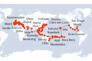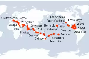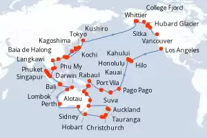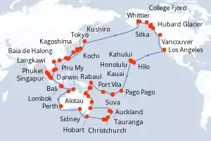 World Cruise Grand Circle Pacific - Los Itinerario: Los Angeles , Hilo , Kahului , Honolulu , Kauai , Pago Pago , Suva , Isla Dravuni , Port Vila , Luganville , Rabaul , Alotau , Conflict Islands , Cairns , Airelie Beach , Brisbane , Sidney , Auckland , Tauranga , Christchurch , Dunedin , Fjordland , Hobart , Adelaide , Perth , Kimberley Coast , Darwin , Bali , Lombok , Singapur , Phuket , Langkawi , Penang , Kuala Lumpur , Phu My , Cami Ranh , Baia de Halong , Hong Kong , Hong Kong , Taipei , Ishigaki , Kagoshima , Kochi , Osaka , Tokyo , Miyako , Kushiro , Whittier , College Fjord , Hubard Glacier , Sitka , Juneau , Ketchikán , Vancouver Comidas incluidas Coral Princess 111 días Camarote estándar Los Angeles 21/01/2027 desde US$19239 EL PRECIO NO INCLUYE LA PERCEPCIÓN DEL 30% DE AFIP - RG 5463 TARIFA NO REEMBOLSABLE Comidas incluidas Ver las ofertas