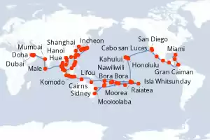 Estados Unidos,Islas Caimán,Colombia,Guatemala,México,Francia,Iles Cook,Tonga,Fidji (islas),Vanuatu,Nueva Caledonia,Australia,Indonesia,Singapur,Vietnam,China,Corea del Sur,Japón,Taiwán,Filipinas,Brun Itinerario: Miami , Gran Caiman , Cartagena de Indias , Puerto Quetzal , Acapulco , Cabo san Lucas , San Diego , Los Angeles , Kahului , Nawiliwili , Honolulu , Hilo , Bora Bora , Raiatea , Moorea , Papeete , Huahine , Rarotonga , Alofi , Vavau , Savusavu , Puerto Denarau , Lautoka , Port Vila , Lifou , Nouméa , Sidney , Mooloolaba , Isla Whitsunday , Cairns , Cairns , Darwin , Darwin , Komodo , Lombok , Benoa , Semarang , Jakarta , Singapur , Ko Samui , Laem Chabang , Laem Chabang , Ho Chi Minh-Ville , Hue , Hanoï , Hong Kong , Shanghai , Shanghai , Incheon , Nagasaki , Hiroshima , Kochi , Kobe , Shimizu , Yokohama , Yokohama , Miyakojima , Taipei , Kaoshiung , Manila , Coron , Puerto Princesa , Muara , Singapur , Singapur , Port Kelang , Penang , Phuket , , Male , Mumbai , Mumbai , Dubai , Abu Dhabi , Doha Comidas incluidas Oceania Vista 128 días Camarote balcón Miami 06/01/2027 desde US$68730 EL PRECIO NO INCLUYE LA PERCEPCIÓN DEL 30% DE AFIP - RG 5463 TARIFA NO REEMBOLSABLE Comidas incluidas Ver las ofertas