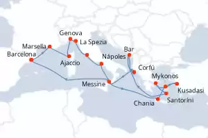 The Best of the Mediterranean Itinerario: Barcelona , Marsella , Ajaccio , Genova , La Spezia , La Spezia , Civitavecchia - Roma , Nápoles , Chania , Kusadasi , Mykonos , El Pireo Atenas , Santoríni , Bar , Corfú , Messine , Barcelona Comidas incluidas Sun Princess 22 días Camarote estándar Barcelona 15/08/2027 desde US$3802 EL PRECIO NO INCLUYE LA PERCEPCIÓN DEL 30% DE AFIP - RG 5463 TARIFA NO REEMBOLSABLE Comidas incluidas Otras fechas : 23 mayo 27 Ver las ofertas