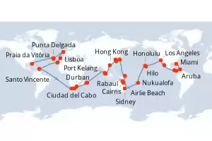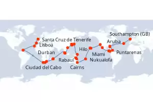 Reino Unido,Portugal,España,San Vincent y las Granadinas,Sudafrica,maurice,Malasia,Singapur,China,Japón,Papúa Nueva Guinea,Australia,Tonga,Francia,Estados Unidos,México,Costa Rica,Panamá,Paises Bajos Itinerario: Miami , Praia da vitoria , Punta Delgada , Southampton , Lisboa , Santa Cruz de Tenerife , Santo Vincente , Ciudad del Cabo , Ciudad del Cabo , Puerto Elizabeth , Puerto Elizabeth , Durban , Isla de la Reunion , Ile Maurice , Port Kelang , Singapur , Singapur , Hong Kong , Hong Kong , Pusan , Nagasaki , Kagoshima , Yokohama , Yokohama , Rabaul , Cairns , Airlie Beach , Sidney , Sidney , Nukualofa , date , Honolulu , Honolulu , Hilo , Los Angeles , Cabo san Lucas , Puntarenas , Canal de Panama , Aruba , Miami Comidas incluidas Queen Elizabeth 114 días Camarote estándar Miami 06/01/2028 desde US$22189 EL PRECIO NO INCLUYE LA PERCEPCIÓN DEL 30% DE AFIP - RG 5463 TARIFA NO REEMBOLSABLE Comidas incluidas Ver las ofertas