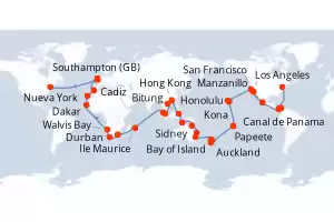 Reino Unido,Colombia,Panamá,México,Estados Unidos,Francia,Nueva Zelanda,Australia,Indonesia,China,Vietnam,Singapur,Malasia,maurice,Sudafrica,Namibia,Senegal,España Itinerario: Southampton , Nueva York , Cartagena de Indias , Canal de Panama , Canal de Panama , Fuerte amador , Fuerte amador , Manzanillo , Los Angeles , Los Angeles , San Francisco , San Francisco , Honolulu , Kona , Papeete , Moorea , date , Bay of Island , Auckland , Tauranga , Sidney , Sidney , Brisbane , Yorkeys Knob , Darwin , Bitung , Hong Kong , Hong Kong , Chan May , Singapur , Singapur , Port Kelang , Ile Maurice , Durban , Ciudad del Cabo , Ciudad del Cabo , Walvis Bay , Dakar , Santa Cruz de Tenerife , Cadiz , Southampton Comidas incluidas Queen Mary 2 109 días Camarote estándar Southampton 11/01/2026 desde US$17452 EL PRECIO NO INCLUYE LA PERCEPCIÓN DEL 30% DE AFIP - RG 5463 TARIFA NO REEMBOLSABLE Comidas incluidas Ver las ofertas