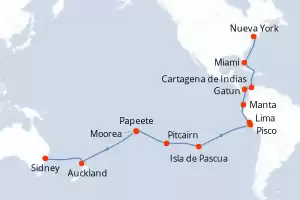De Nueva York a Sidney Itinerario: Nueva York , Nueva York , Miami , Cartagena de Indias , Gatun , Manta , Lima , Lima , Pisco , Isla de Pascua , Pitcairn , Papeete , Moorea , Auckland , Sidney Comidas incluidas Crown Princess 39 días Camarote estándar Nueva York 26/07/2026 desde US$5480 EL PRECIO NO INCLUYE LA PERCEPCIÓN DEL 30% DE AFIP - RG 5463 TARIFA NO REEMBOLSABLE Comidas incluidas Ver las ofertas