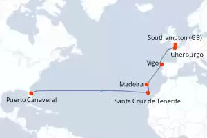 Estados Unidos, España, Portugal, Francia, Reino Unido Itinerario: Southampton , Cherburgo , Vigo , Madeira , Santa Cruz de Tenerife , Puerto Canaveral Comidas incluidas Sky Princess 16 días Camarote estándar Southampton 05/11/2026 desde US$1109 EL PRECIO NO INCLUYE LA PERCEPCIÓN DEL 30% DE AFIP - RG 5463 TARIFA NO REEMBOLSABLE Comidas incluidas Ver las ofertas