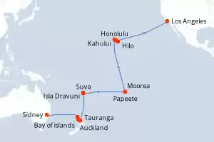 Australia,Nueva Zelanda,Fidji (islas),Francia,Estados Unidos Itinerario: Sidney , Bay of islands , Auckland , Tauranga , Suva , Isla Dravuni , Papeete , Moorea , Honolulu , Kahului , Hilo , Los Angeles Comidas incluidas Crown Princess 30 días Camarote estándar Sidney 04/11/2026 desde US$3525 EL PRECIO NO INCLUYE LA PERCEPCIÓN DEL 30% DE AFIP - RG 5463 TARIFA NO REEMBOLSABLE Comidas incluidas Ver las ofertas