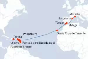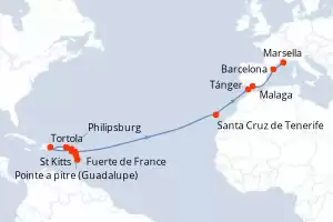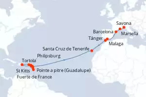 Antillas, Islas Vírgenes, Canarias, Marruecos, España, Francia Itinerario: Pointe a pitre (Guadalupe) , St Kitts , Tortola , Santo Domingo , Philipsburg , Fort-de-France , Pointe a pitre (Guadalupe) , St Kitts , Antigua , Santa Cruz de Tenerife , Tánger , Malaga , Barcelona , Marsella Comidas incluidas Costa Favolosa 23 días Camarote estándar Pointe a pitre (Guadalupe) 26/02/2027 desde US$1866 EL PRECIO NO INCLUYE LA PERCEPCIÓN DEL 30% DE AFIP - RG 5463 TARIFA NO REEMBOLSABLE Comidas incluidas Ver las ofertas