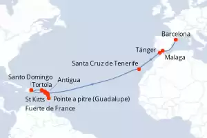 Antillas, Islas Vírgenes, Canarias, Marruecos, España Itinerario: Pointe a pitre (Guadalupe) , St Kitts , Tortola , Santo Domingo , Philipsburg , Fort-de-France , Pointe a pitre (Guadalupe) , St Kitts , Antigua , Santa Cruz de Tenerife , Tánger , Malaga , Barcelona Comidas incluidas Costa Favolosa 22 días Camarote estándar Pointe a pitre (Guadalupe) 26/02/2027 desde US$1781 EL PRECIO NO INCLUYE LA PERCEPCIÓN DEL 30% DE AFIP - RG 5463 TARIFA NO REEMBOLSABLE Comidas incluidas Ver las ofertas