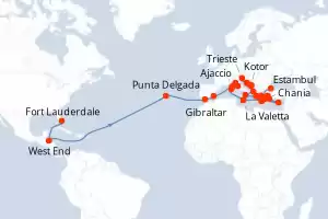 Rutas de Mar y Leyenda Itinerario: Fort Lauderdale , West End , Punta Delgada , Gibraltar , Cartagena , Ajaccio , Civitavecchia - Roma , Pisa/Florencia (Livorno) , Ajaccio , Alghero , La Valetta , Kotor , Dubrovnik , Split , Trieste , Split , Kotor , Corfú , Katakolon , Chania , Santoríni , Rodas , Limassol , Kusadasi , El Pireo Atenas , Chania , Katakolon , Messine , La Valetta , Santoríni , Mykonos , Kusadasi , Estambul , Estambul Comidas incluidas Enchanted Princess 47 días Camarote estándar Fort Lauderdale 16/04/2027 desde US$8234 EL PRECIO NO INCLUYE LA PERCEPCIÓN DEL 30% DE AFIP - RG 5463 TARIFA NO REEMBOLSABLE Comidas incluidas Ver las ofertas