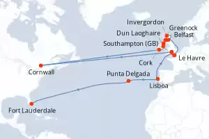 Gran aventura por Europa Occidental y la Itinerario: Fort Lauderdale , Punta Delgada , Lisboa , Le Havre , Southampton , Cornwall , Cork , Dun Laoghaire , Belfast , Greenock , Invergordon , Edimbourg , Le Havre , Southampton Comidas incluidas Majestic Princess 26 días Camarote estándar Fort Lauderdale 03/04/2026 desde US$3348 EL PRECIO NO INCLUYE LA PERCEPCIÓN DEL 30% DE AFIP - RG 5463 TARIFA NO REEMBOLSABLE Comidas incluidas Ver las ofertas