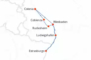 Alemania,Francia Itinerario: Colonia , Wiesbaden , Ludwigshafen , Estrasburgo , Rudesheim , Coblenza , Colonia Comidas incluidas MS Rhein Melodie 6 días Camarote exterior Colonia 02/10/2026 desde US$871 EL PRECIO NO INCLUYE LA PERCEPCIÓN DEL 30% DE AFIP - RG 5463 TARIFA NO REEMBOLSABLE Comidas incluidas Otras fechas : 31 mayo 26 5-24-29 jun. 26 4 jul. 26 Otras fechas Ver las ofertas