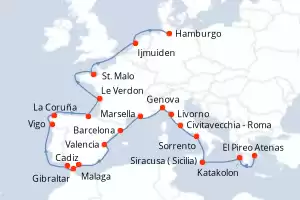 Grecia,Italia,Francia,España,Reino Unido,Paises Bajos,Alemania Itinerario: El Pireo Atenas , Katakolon , Malaga - Corfu , Siracusa ( Sicilia) , Sorrento , Civitavecchia - Roma , Livorno , Genova , Marsella , Barcelona , Valencia , Malaga , Malaga , Gibraltar , Cadiz , Vigo , La Coruña , Bilbao , Le Verdon , St. Malo , Ijmuiden , Hamburgo Comidas incluidas Vasco da Gama 28 días Camarote exterior El Pireo Atenas 04/04/2026 desde US$7091 EL PRECIO NO INCLUYE LA PERCEPCIÓN DEL 30% DE AFIP - RG 5463 TARIFA NO REEMBOLSABLE Comidas incluidas Ver las ofertas