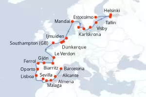Portugal, España, Francia, Bélgica, Reino Unido, Paises Bajos, Noruega, Dinamarca, Suecia, Finlandia, Estonia Itinerario: Estocolmo , Tallin , Helsinki , Visby , Karlskrona , Copenhague , Arhus , Mandal , Ijmuiden , Dunkerque , Zeebrugge , Southampton , Le Verdon , Biarritz , Gijón , Ferrol , Oporto , Lisboa , Sevilla , Malaga , Almeria , Alicante , Barcelona Comidas incluidas Oceania Sirena 25 días Camarote estándar Estocolmo 24/07/2026 desde US$9173 EL PRECIO NO INCLUYE LA PERCEPCIÓN DEL 30% DE AFIP - RG 5463 TARIFA NO REEMBOLSABLE Comidas incluidas Ver las ofertas
