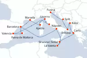 España,Francia,Italia,Malta,Grecia,Montenegro,Croacia Itinerario: Barcelona , Marsella , Ajaccio , Livorno , Civitavecchia - Roma , Valencia , Palma de Mallorca , Barcelona , Nápoles , La Valetta , Siracusa ( Sicilia) , Corfú , Kotor , Brindisi , Split , Fusina Comidas incluidas EXPLORA I 20 días Suite Barcelona 25/03/2026 desde US$11935 Comidas incluidas Ver las ofertas