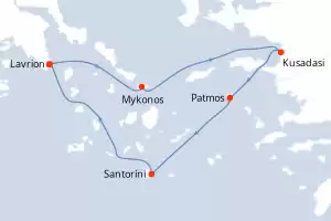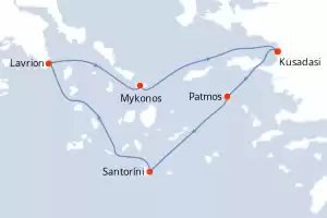 Turquía,Grecia Itinerario: Lavrion (Atenas) , Mykonos , Patmos , Kusadasi , Santoríni , Lavrion (Atenas) Comidas incluidas Celestyal Discovery 4 días Camarote estándar Lavrion (Atenas) 26/03/2027 desde US$524 EL PRECIO NO INCLUYE LA PERCEPCIÓN DEL 30% DE AFIP - RG 5463 TARIFA NO REEMBOLSABLE Comidas incluidas Otros puertos de embarque : Kusadasi Otras fechas : 19 mar. 27 5 nov. 27 Ver las ofertas
