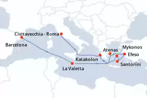 Italia, Grecia, Turquía, Malta, España Itinerario: Barcelona , La Valetta , El Pireo Atenas , Efeso , Santoríni , Mykonos , Katakolon , Civitavecchia - Roma Comidas incluidas Celebrity Equinox 11 días Camarote estándar Barcelona 12/09/2026 desde US$1813 EL PRECIO NO INCLUYE LA PERCEPCIÓN DEL 30% DE AFIP - RG 5463 TARIFA NO REEMBOLSABLE Comidas incluidas Otras fechas : 20 jun. 26 Ver las ofertas